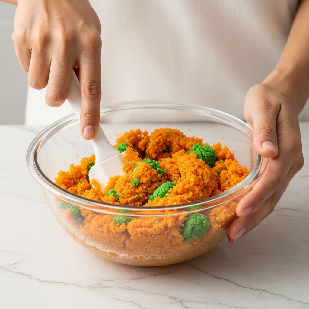 - Mix It All Up: In a medium bowl, combine the ground pumpkin seeds, grated carrots, melted coconut oil, turmeric, and black pepper. Stir everything together until it forms a thick, moldable paste.