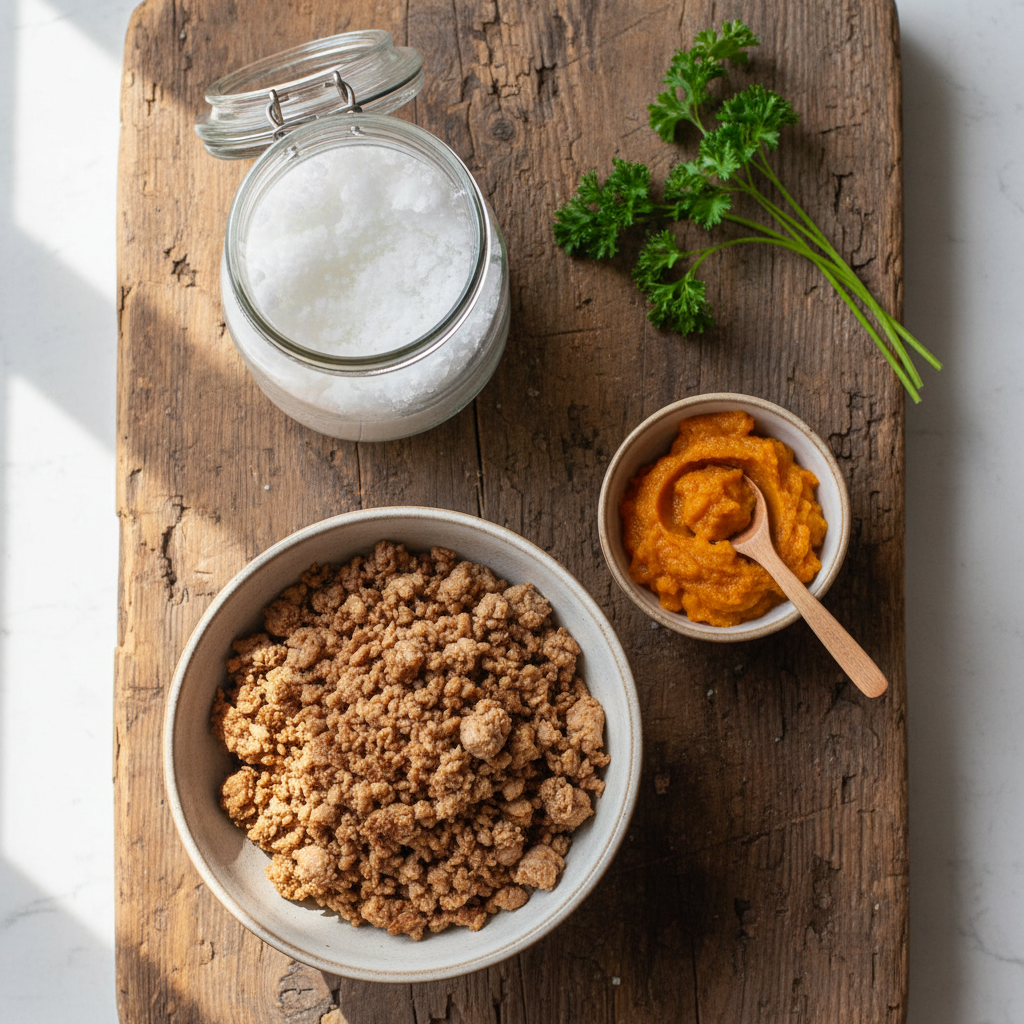 - Combine Ingredients: In a medium-sized mixing bowl, add the cooked ground meat, pumpkin puree, and optional parsley. Pour the melted coconut oil over the top.