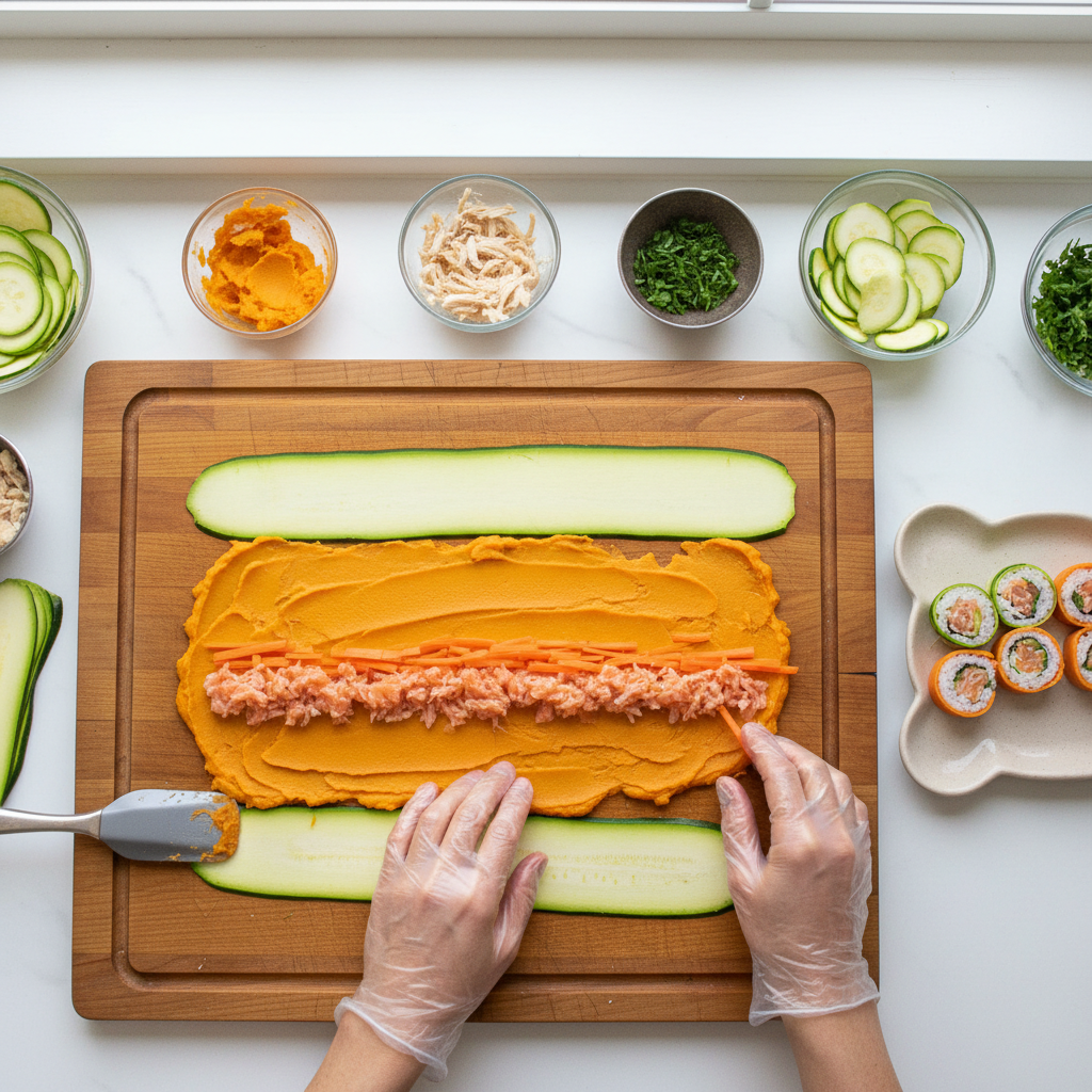 2. Create Your Wrapper: Wash the zucchini. Using a vegetable peeler, carefully peel long, wide ribbons from the zucchini. These will act as your ‘nori’ to hold everything together. Lay a few ribbons on your cutting board or a piece of parchment paper, overlapping them slightly to create a solid sheet.