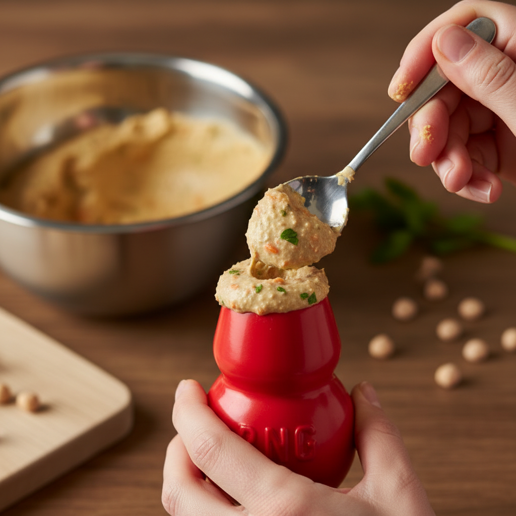 - In a Puzzle Toy: Fill a KONG or other enrichment toy with the hummus and freeze it for a long-lasting, mentally stimulating treat.