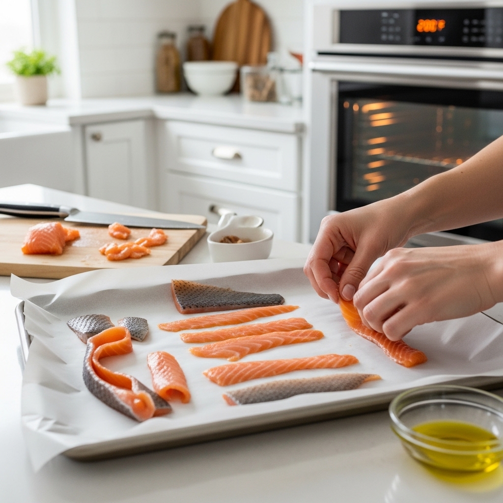 3. Cook It Low and Slow: This is the most crucial step. You want to dehydrate the skin, not fry it. Frying can create harmful compounds and adds unnecessary fat. Preheat your oven to a low temperature, around 200°F (or 95°C). Line a baking sheet with parchment paper and lay the salmon skin strips flat, making sure they don’t overlap.