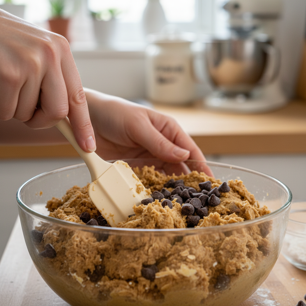 5. Fold in the ‘Chocolate’: Now for the best part! Gently fold the carob chips into the dough until they are evenly spread throughout.