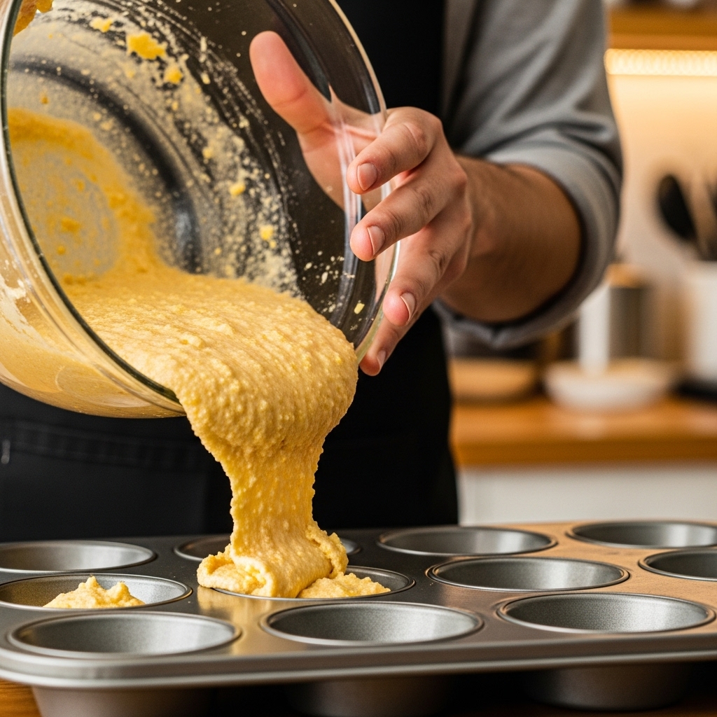 - Pour the batter into your prepared pan or muffin tin. If using a muffin tin, fill each cup about two-thirds full.