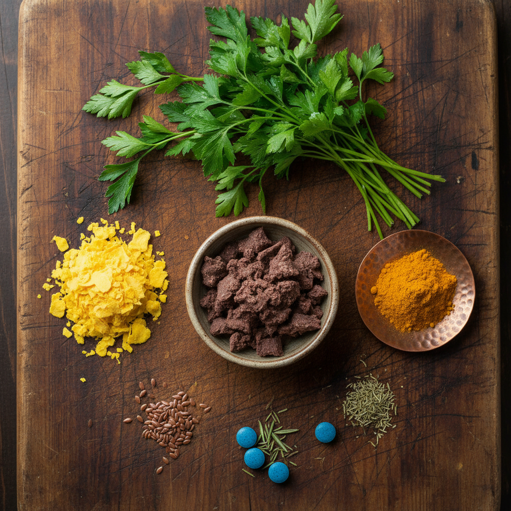 - Gather Your Ingredients: You’ll need 1/2 cup of freeze-dried chicken or salmon, 2 tablespoons of ground flaxseed, 1 tablespoon of dried parsley, and 1 teaspoon of kelp powder.