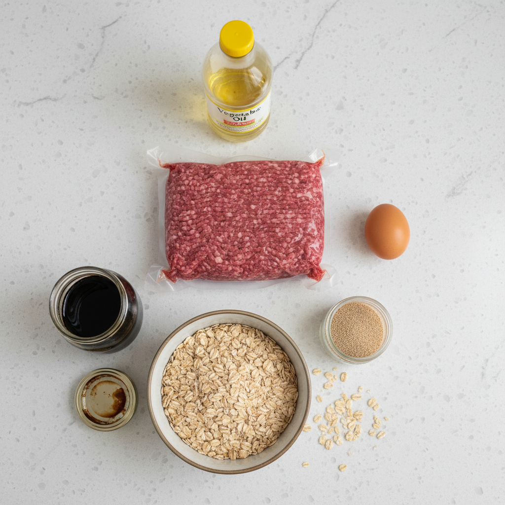 - Combine Ingredients: In a large mixing bowl, add the ground beef, egg, oatmeal, wheat germ, oil, molasses, and salt.