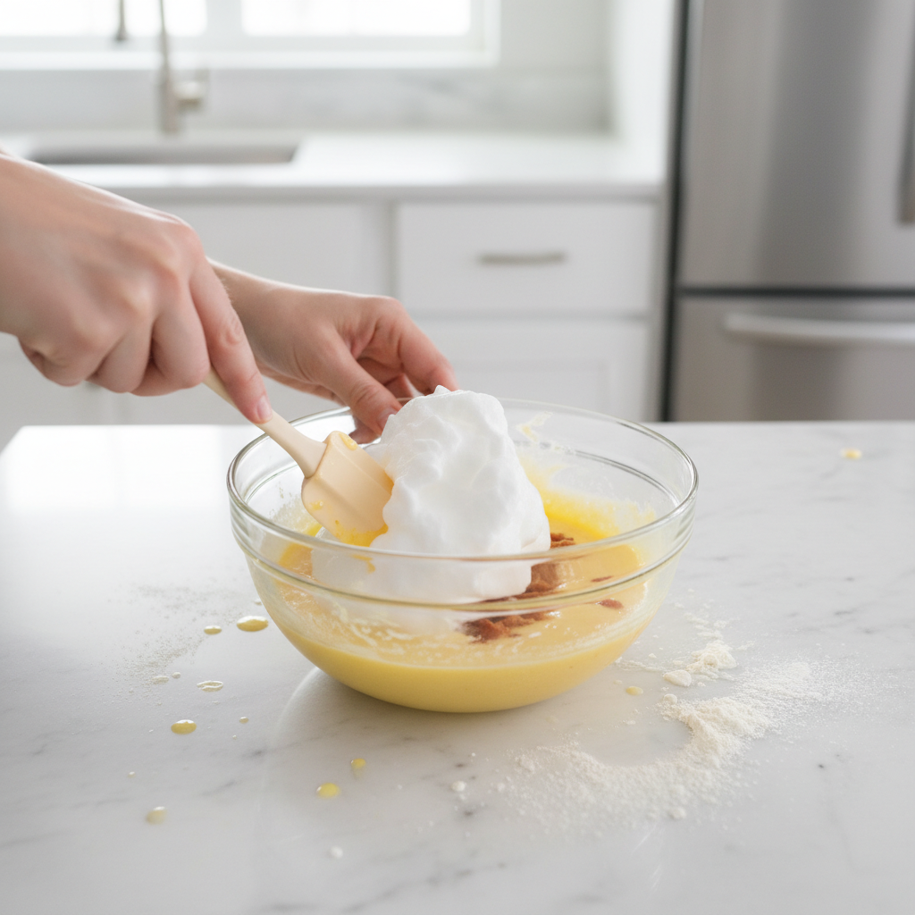 - Combine Gently: Take a scoop of the whipped egg whites and mix it into the yolk batter to lighten it up. Then, gently fold the rest of the egg whites into the batter in two or three additions. Be very gentle—you want to keep as much air in the mixture as possible!
