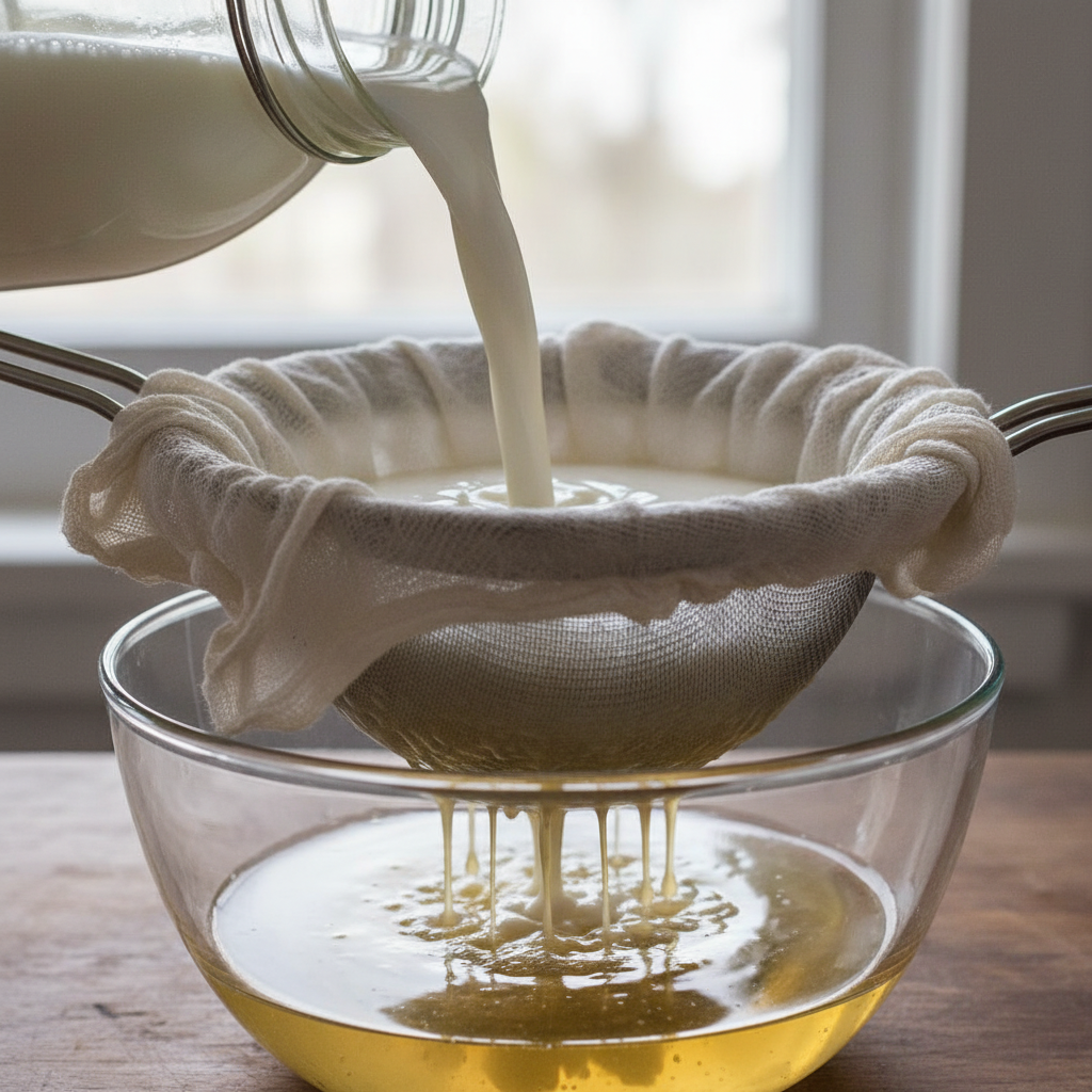 You’ve successfully made liquid kefir! Now for the incredibly simple step that transforms this probiotic drink into a creamy, spreadable cheese that dogs go absolutely wild for. This process is all about separating the solids (curds) from the liquid (whey).