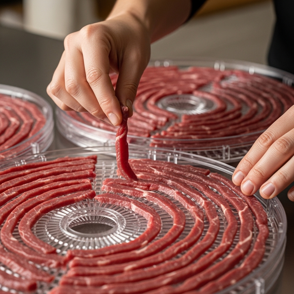 Arrange the venison strips in a single layer on the dehydrator trays, making sure none of the pieces are overlapping. This ensures even airflow and drying. Set your dehydrator to its meat setting, typically around 160°F (70°C).
