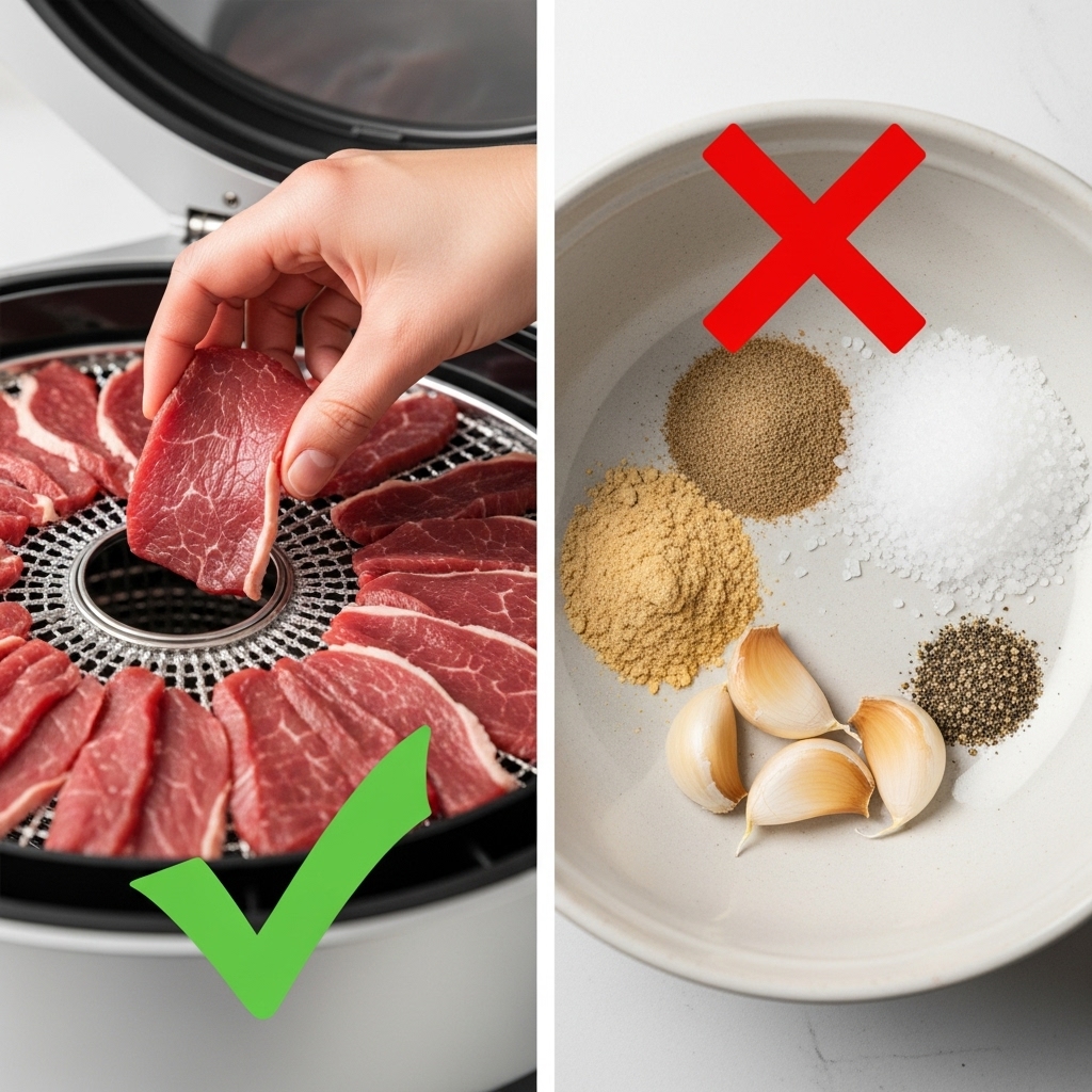 • DO dehydrate the jerky thoroughly. The process of drying at a sustained low heat is what makes the meat safe by removing moisture that bacteria need to grow.