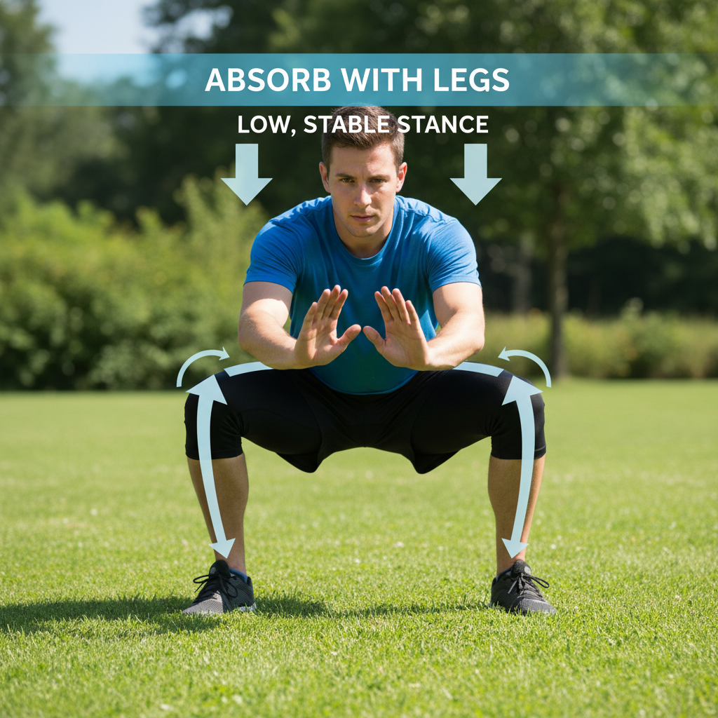 | DO bend your knees and use your legs to absorb the impact. | DON’T catch with a stiff body or just with your arms. |