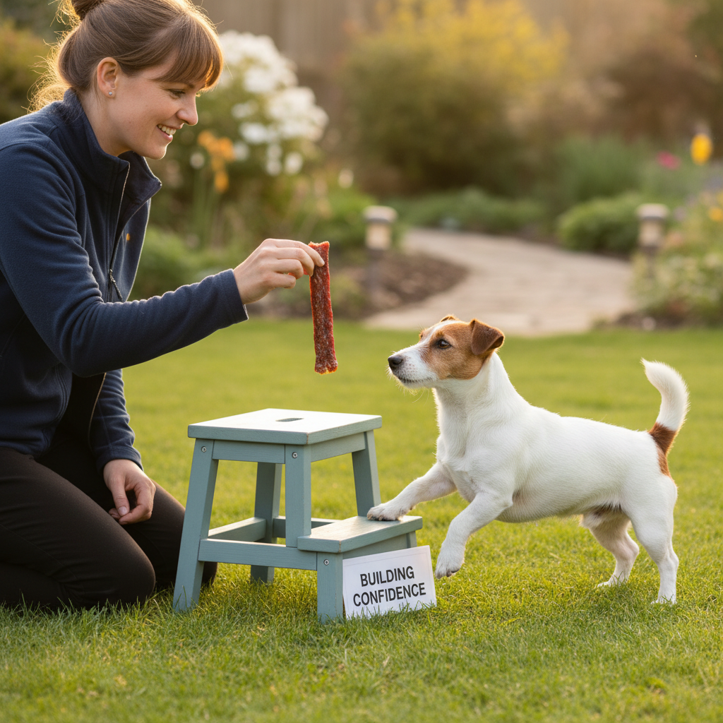 - Step 2: Introduce a Low Platform. Now, find a low, stable object, like a sturdy ottoman, a single porch step, or even a large, firm cushion. Sit on the floor in front of it and encourage your dog to jump onto the object first, and then into your arms. This gets them used to the idea of jumping up and over to get to you.