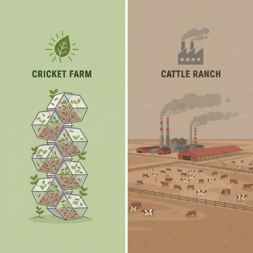 Raising cattle and chickens requires immense resources—land for grazing and growing feed, massive amounts of water, and it produces significant greenhouse gas emissions. Cricket farming, on the other hand, is a model of efficiency.