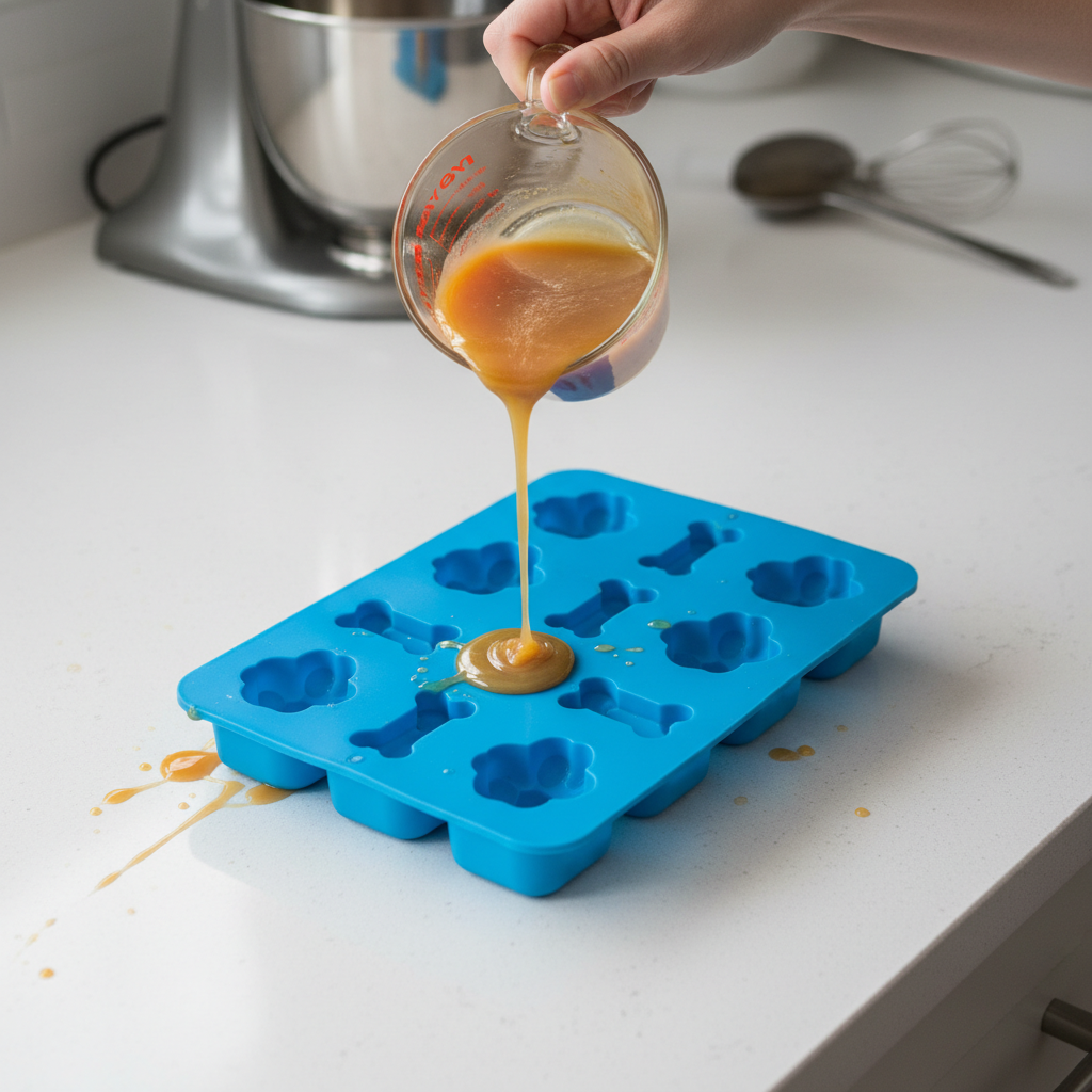 - Pour and Chill: Carefully pour the mixture into silicone molds (paw or bone shapes are fun!) or a simple glass baking dish.